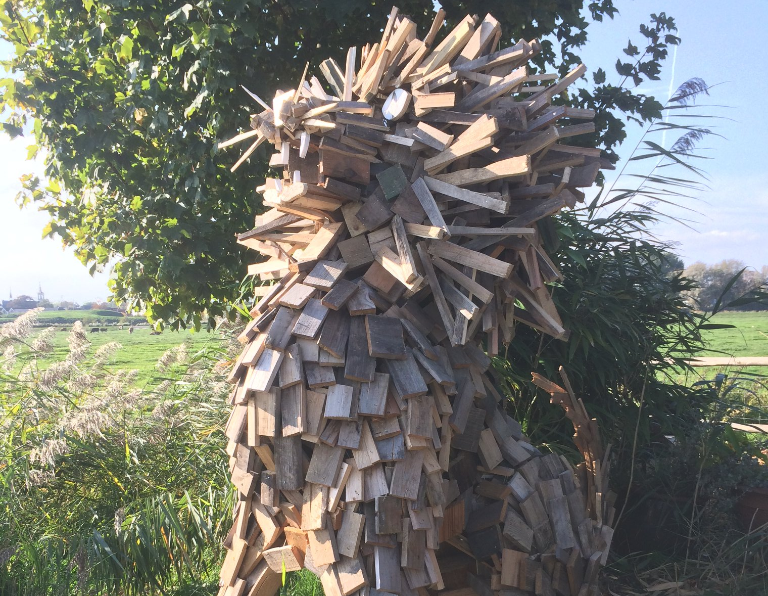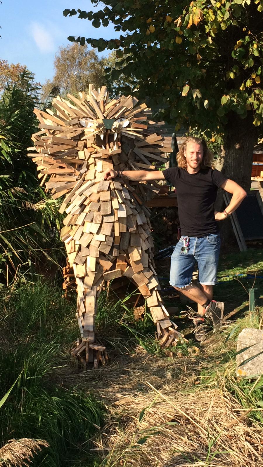 Using a couple of old underlayment boards, reclaimed pallets, a saw, and a nail gun, I collaborated with Vrijplaats X to construct two lions. The lion featured in the photo was mainly shaped with small pieces of wood, and strangely enough, it bears a striking resemblance to its creator.