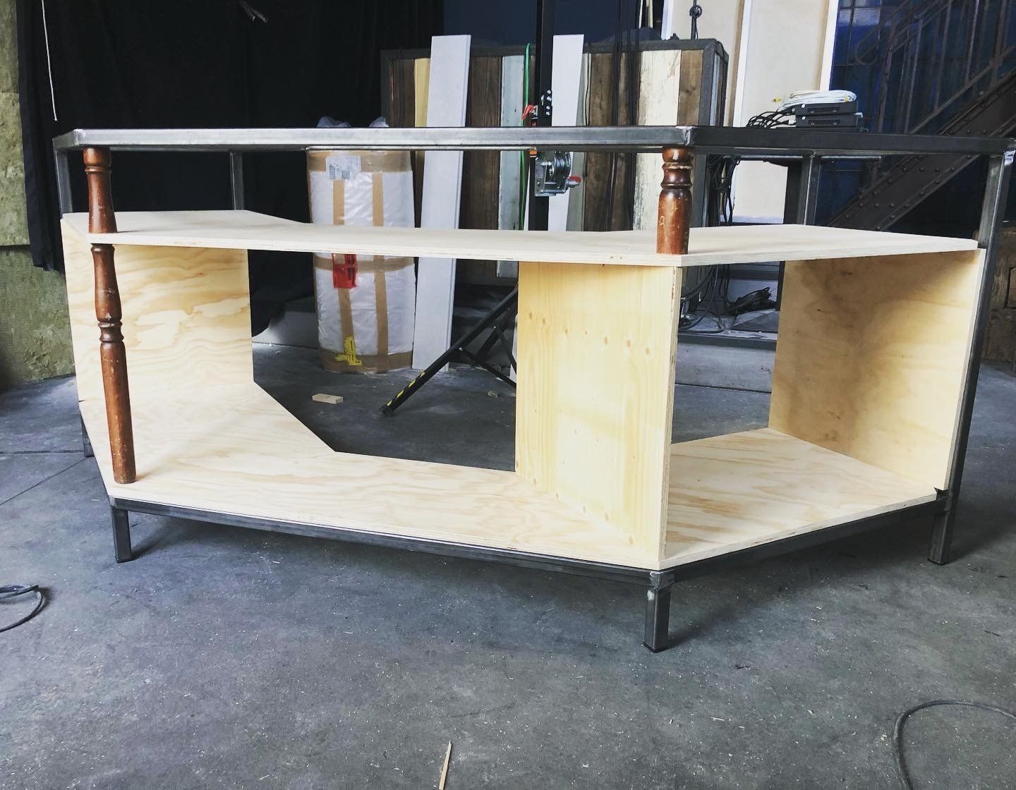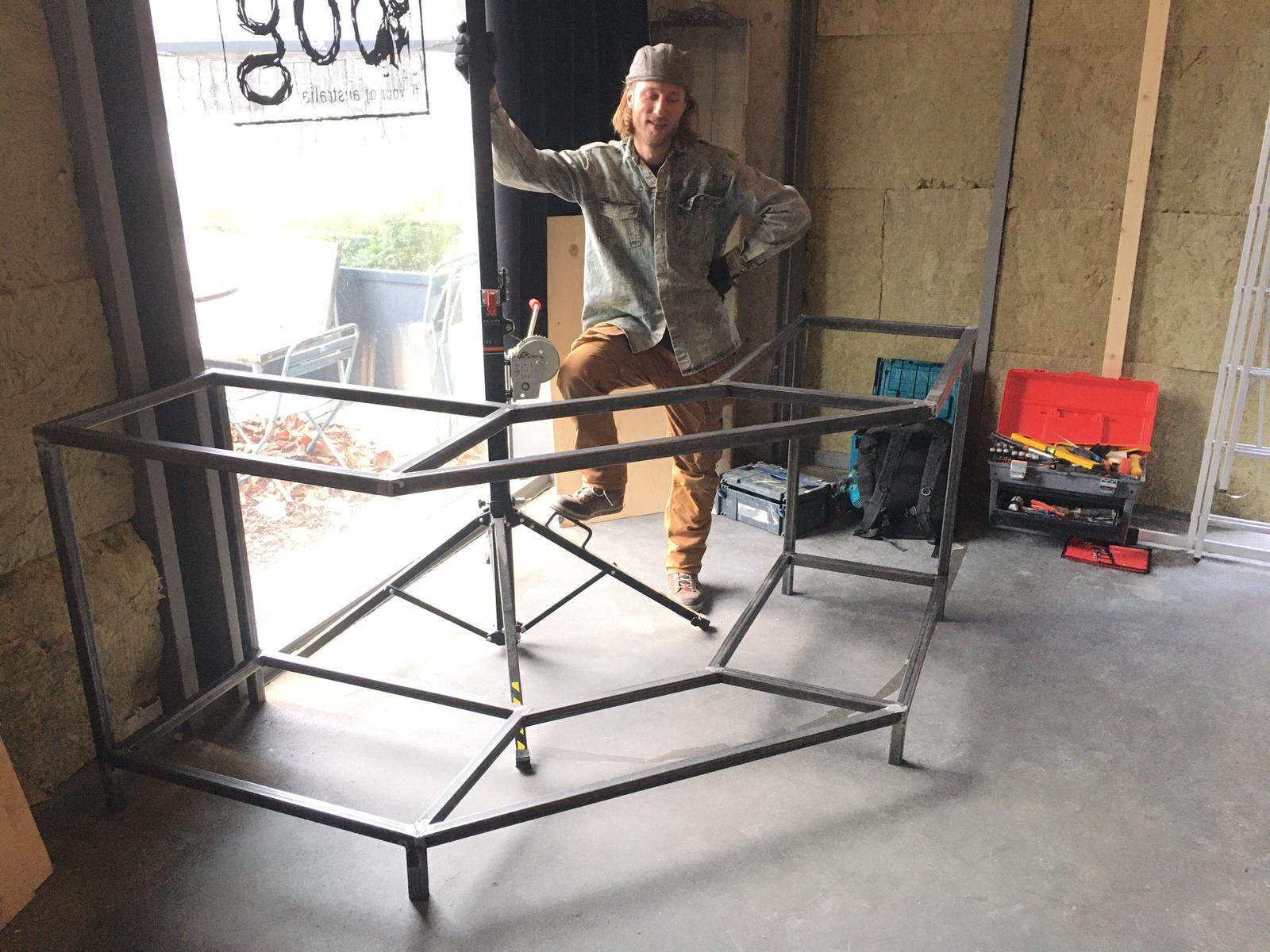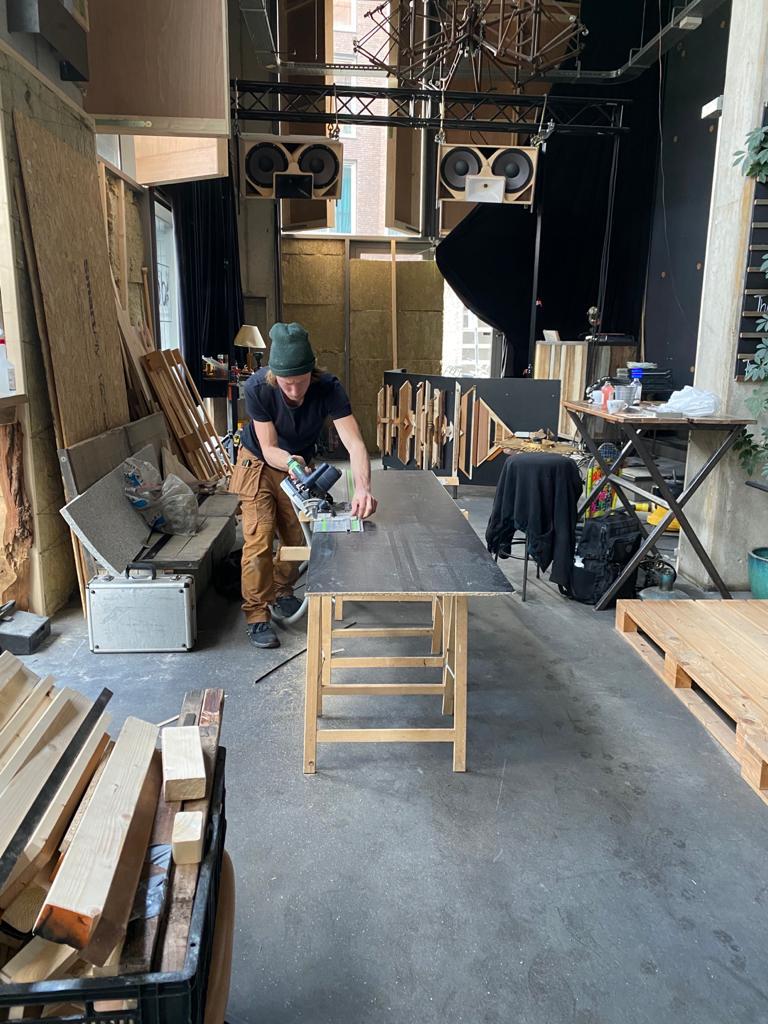 For the new listening bar 'Feed' at Wibautstraat 206, I've meticulously crafted a DJ Booth that perfectly complements the venue's character. By repurposing salvaged materials from the streets, incorporating the vintage table legs from my mother's table, and utilizing leftover building materials from previous renovations, this booth embodies sustainability and recycling. The frame, design, whimsical interior elements, and the wooden artwork are all expressions of collective and personal creativity and playfulness. This ethos aligns with the vision of Feed's owners, who aim to foster a sense of creativity and collaboration through their programming. Moreover, the wooden artwork on the front carries another message within it: it represents the waveform of the lyrics with the beat that says, "Music, makes the people, come together, Yeah!!"