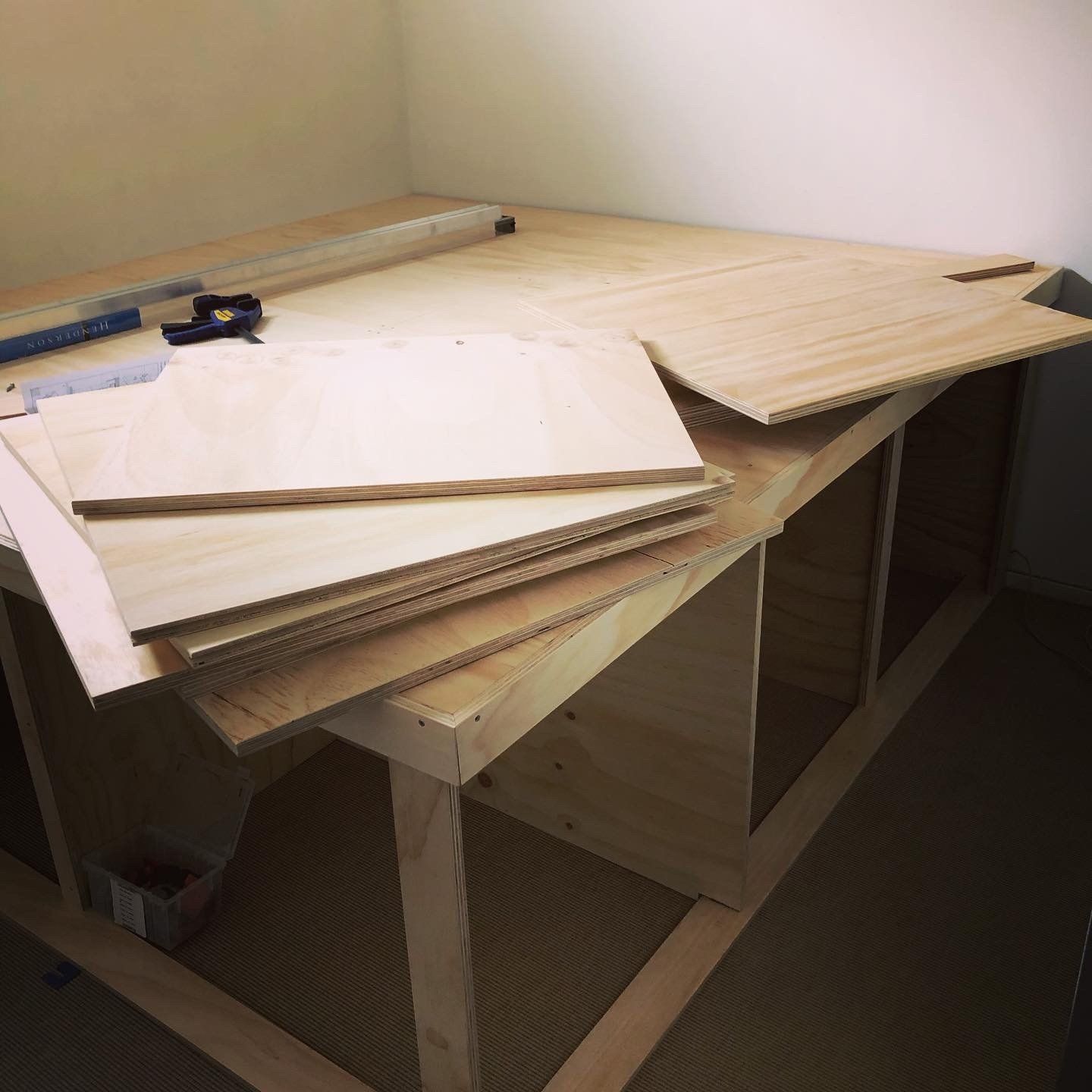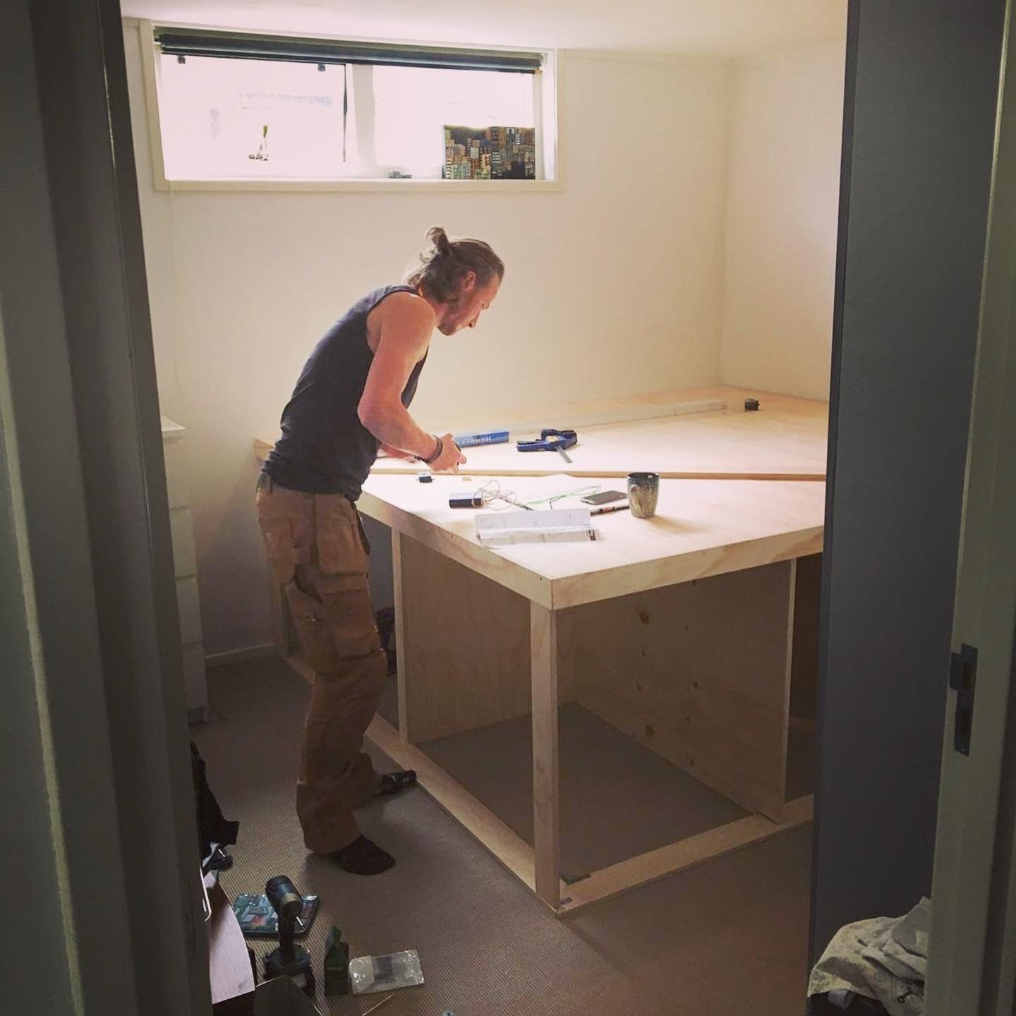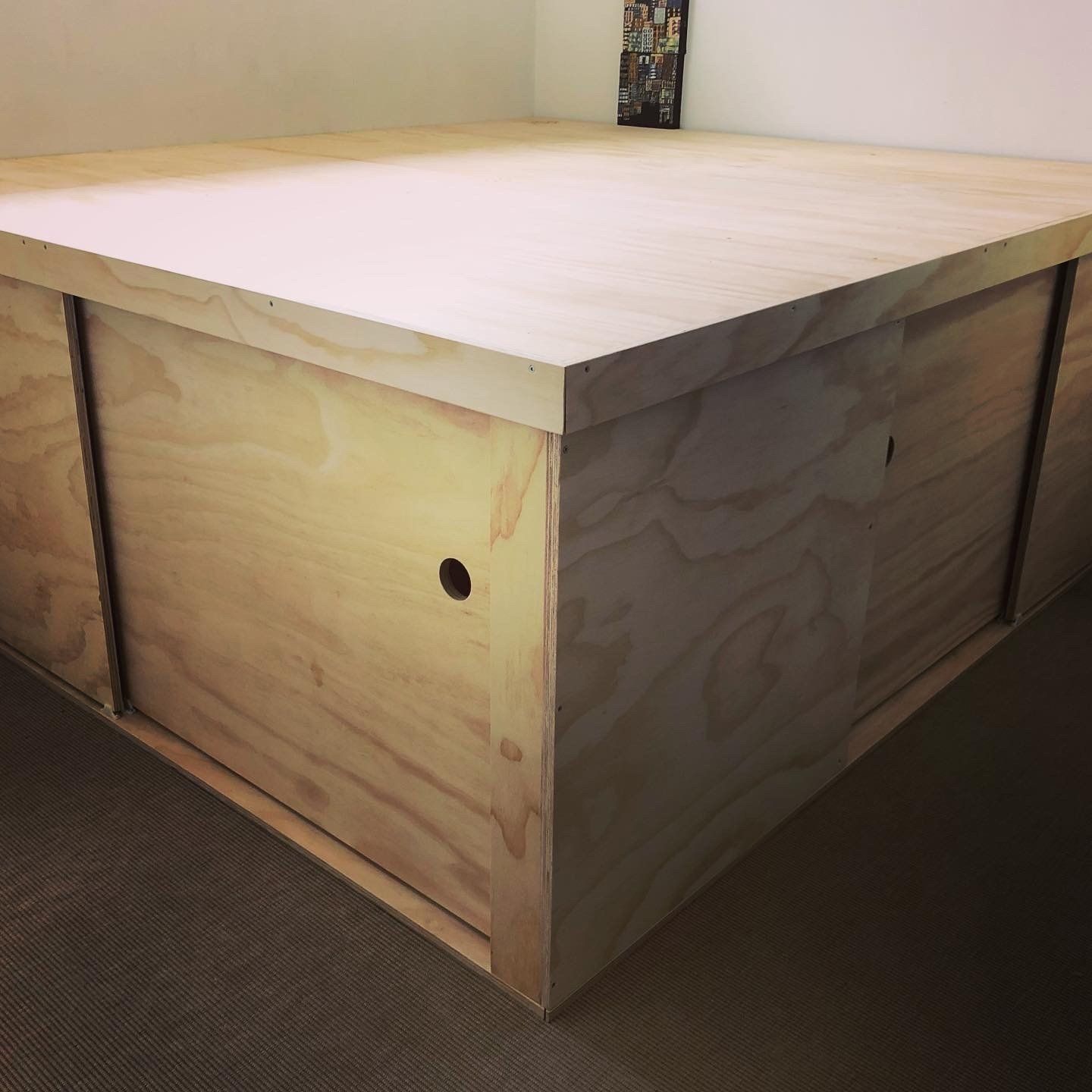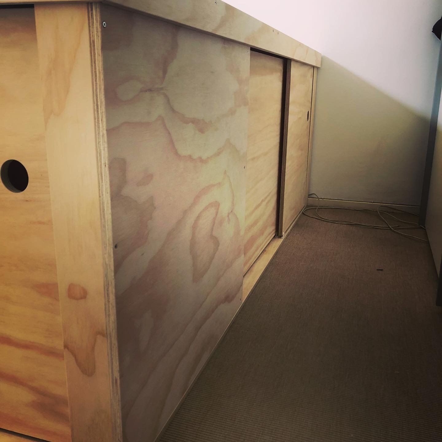 In order to optimize a limited space, I designed a platform bed that incorporates built-in cupboards and storage compartments. This solution proves incredibly useful for those dealing with small rooms that can no longer accommodate a traditional closet.