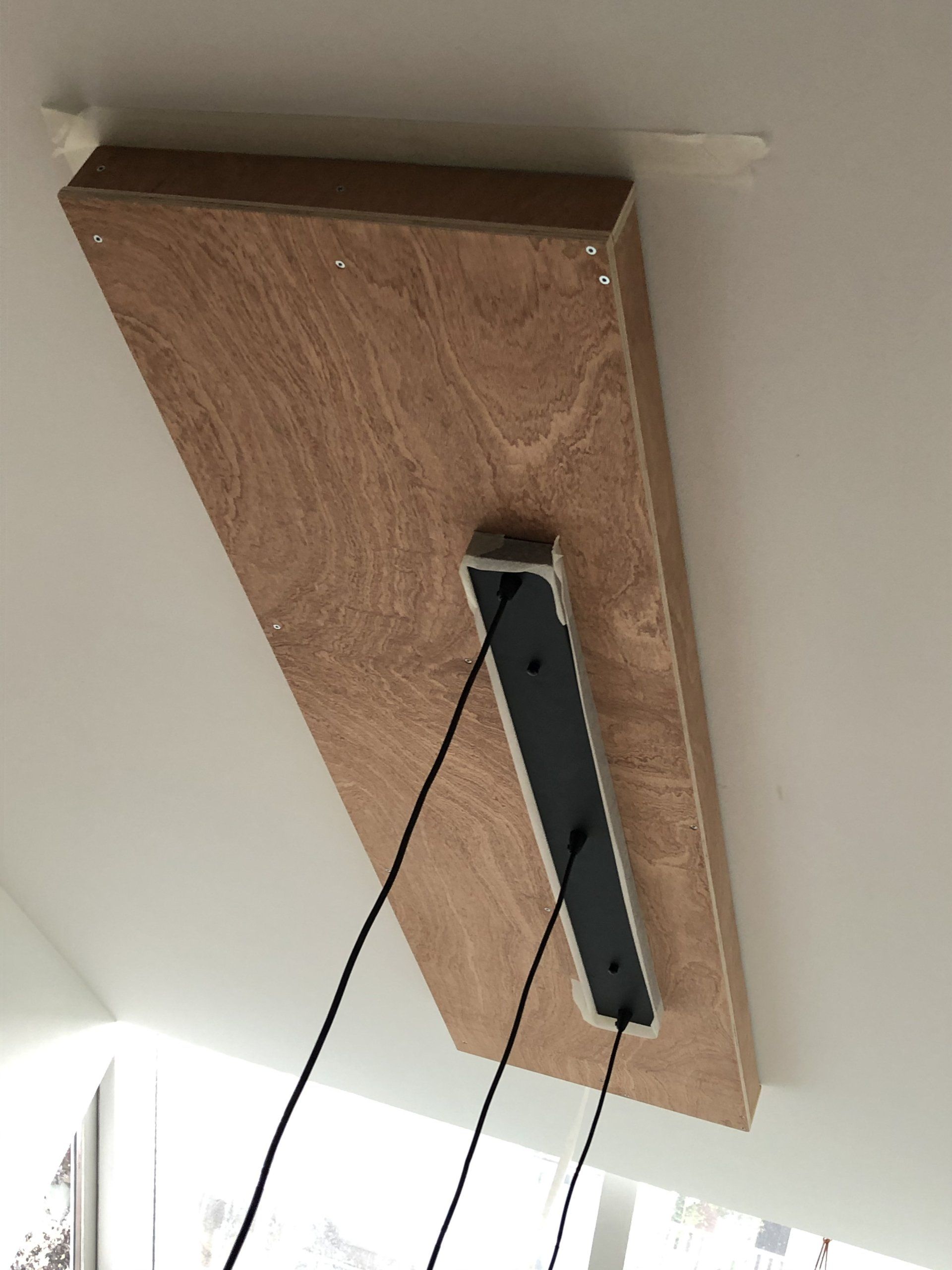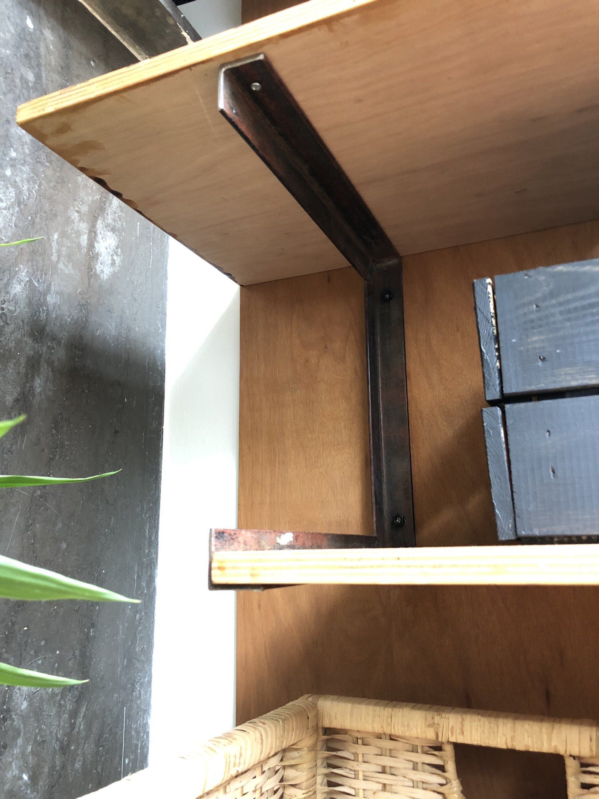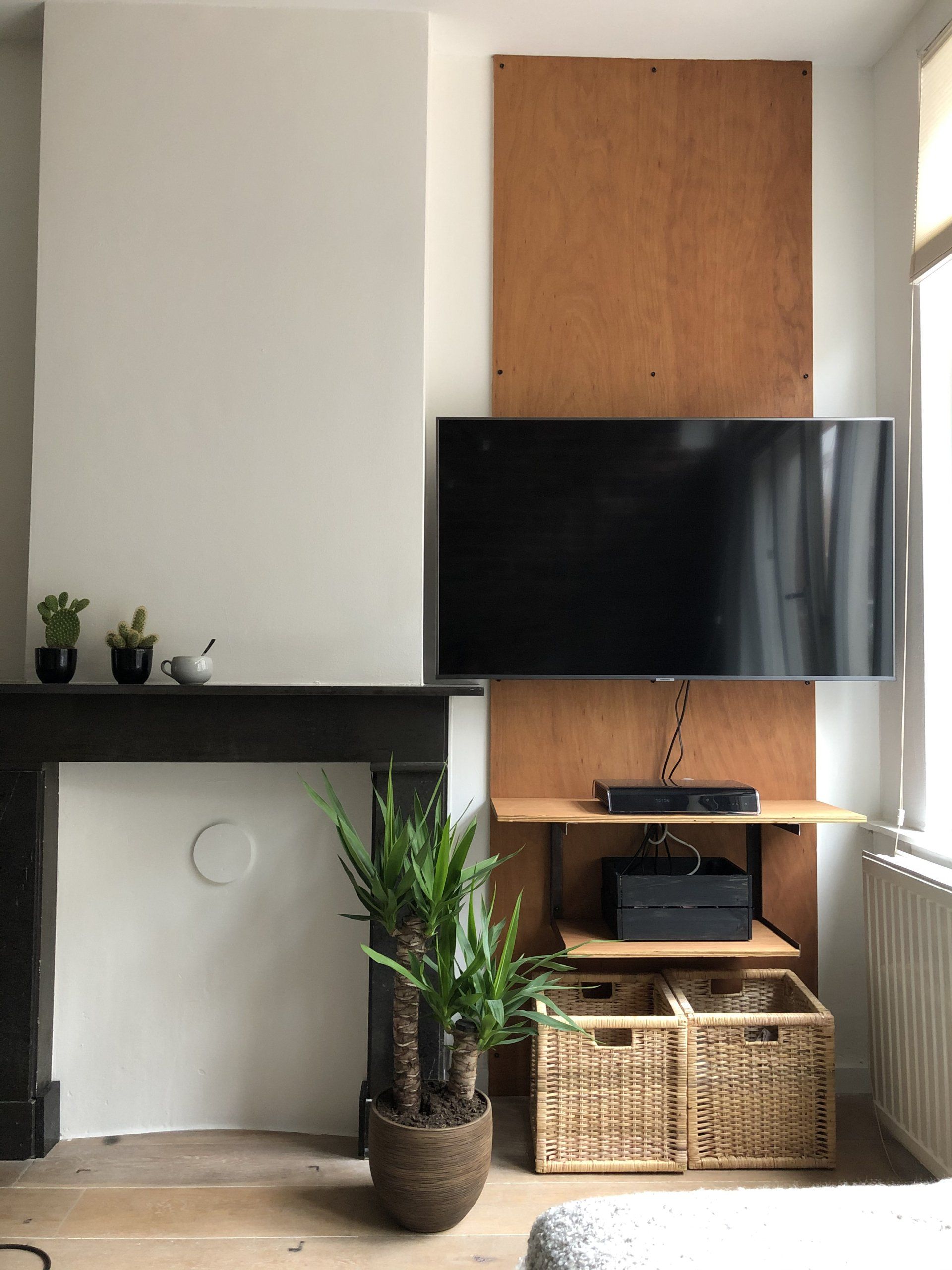 Addressing an unsightly wall in the living room required a touch of creativity. I enhanced this wall with a touch of flair and style by executing a simple yet tasteful design: a wooden panel extending from floor to ceiling, finished with a beautiful oil treatment. To accommodate the router and digital box, I repurposed street-found steel by cutting and welding two brackets.