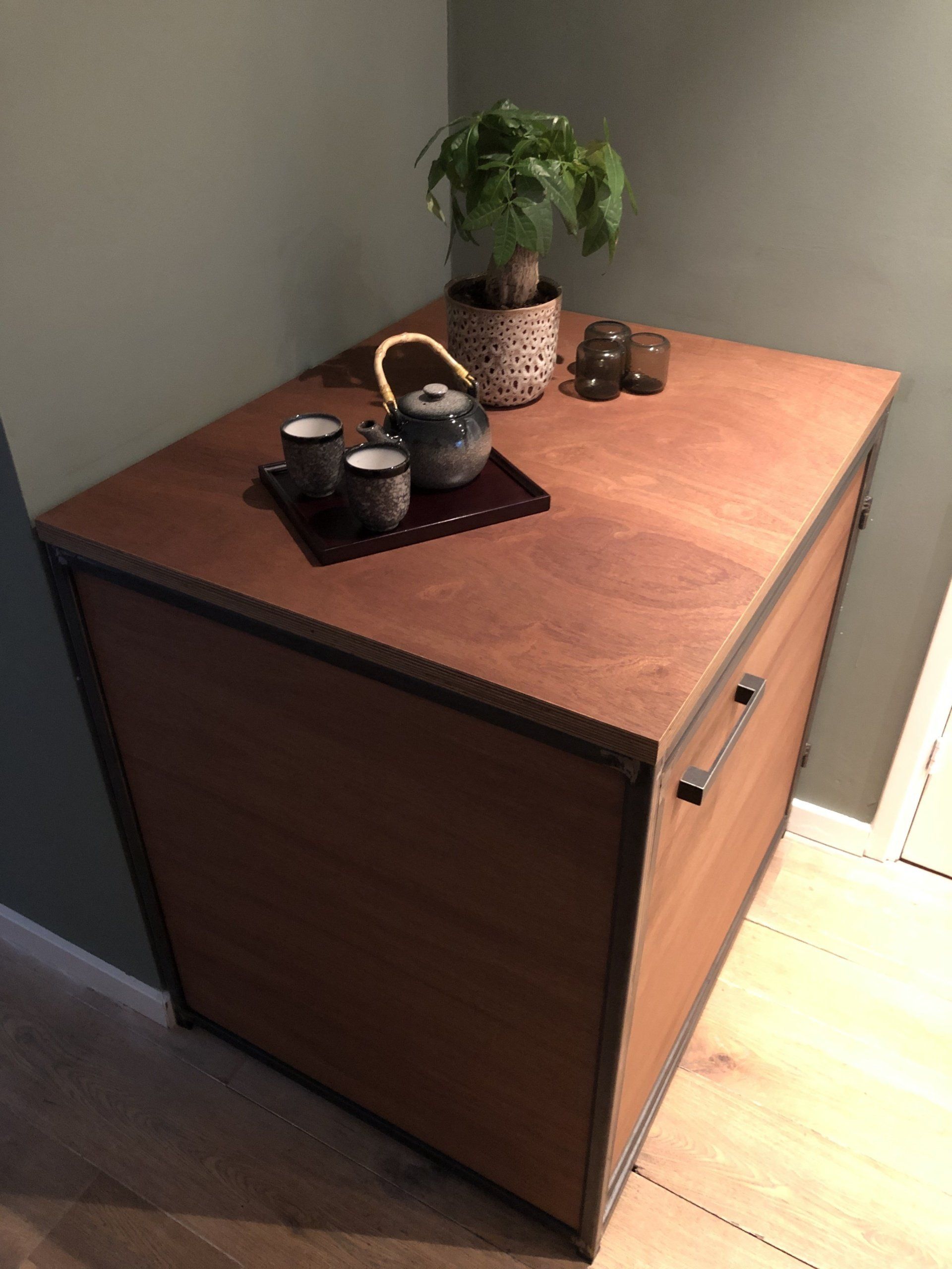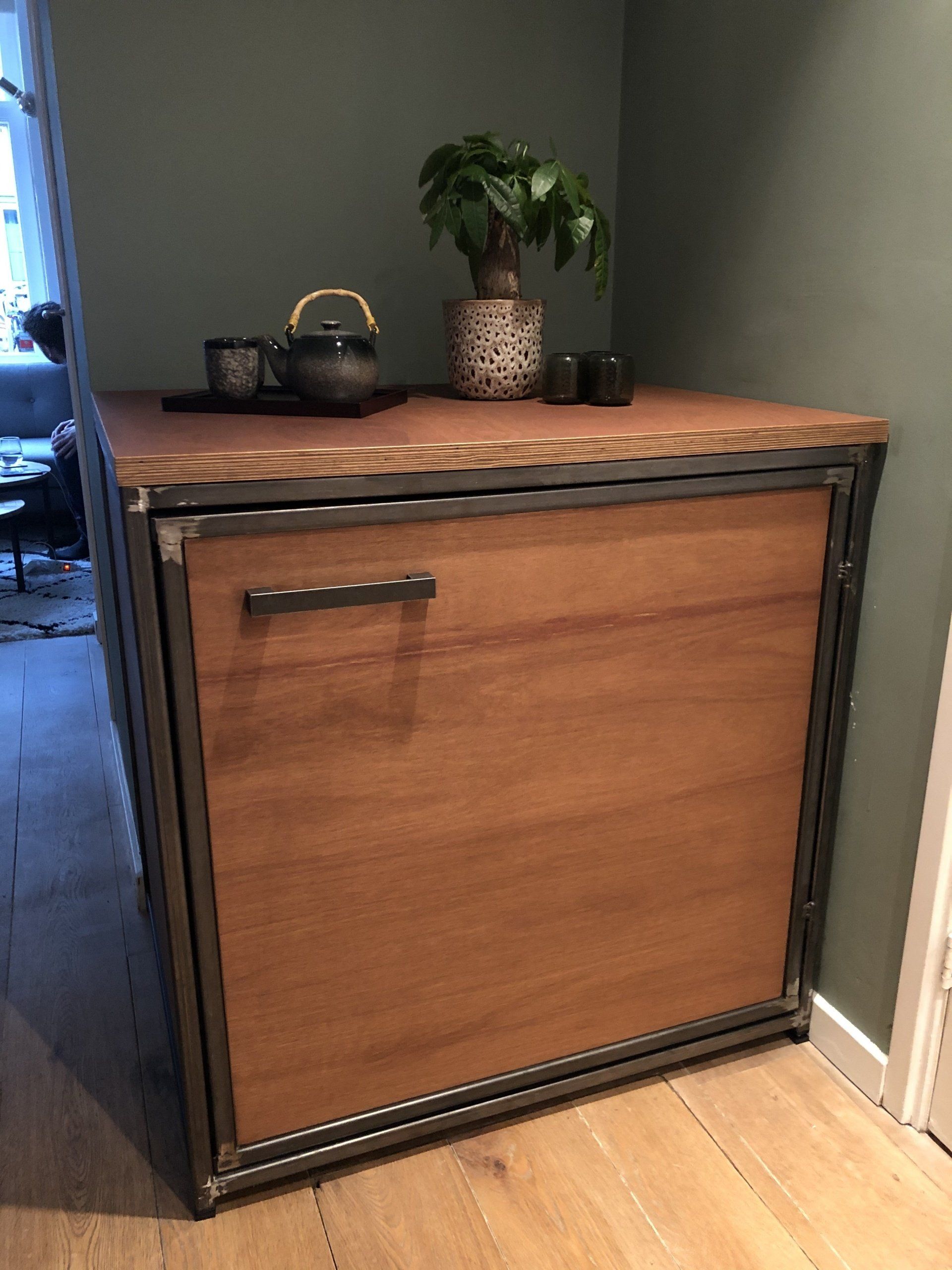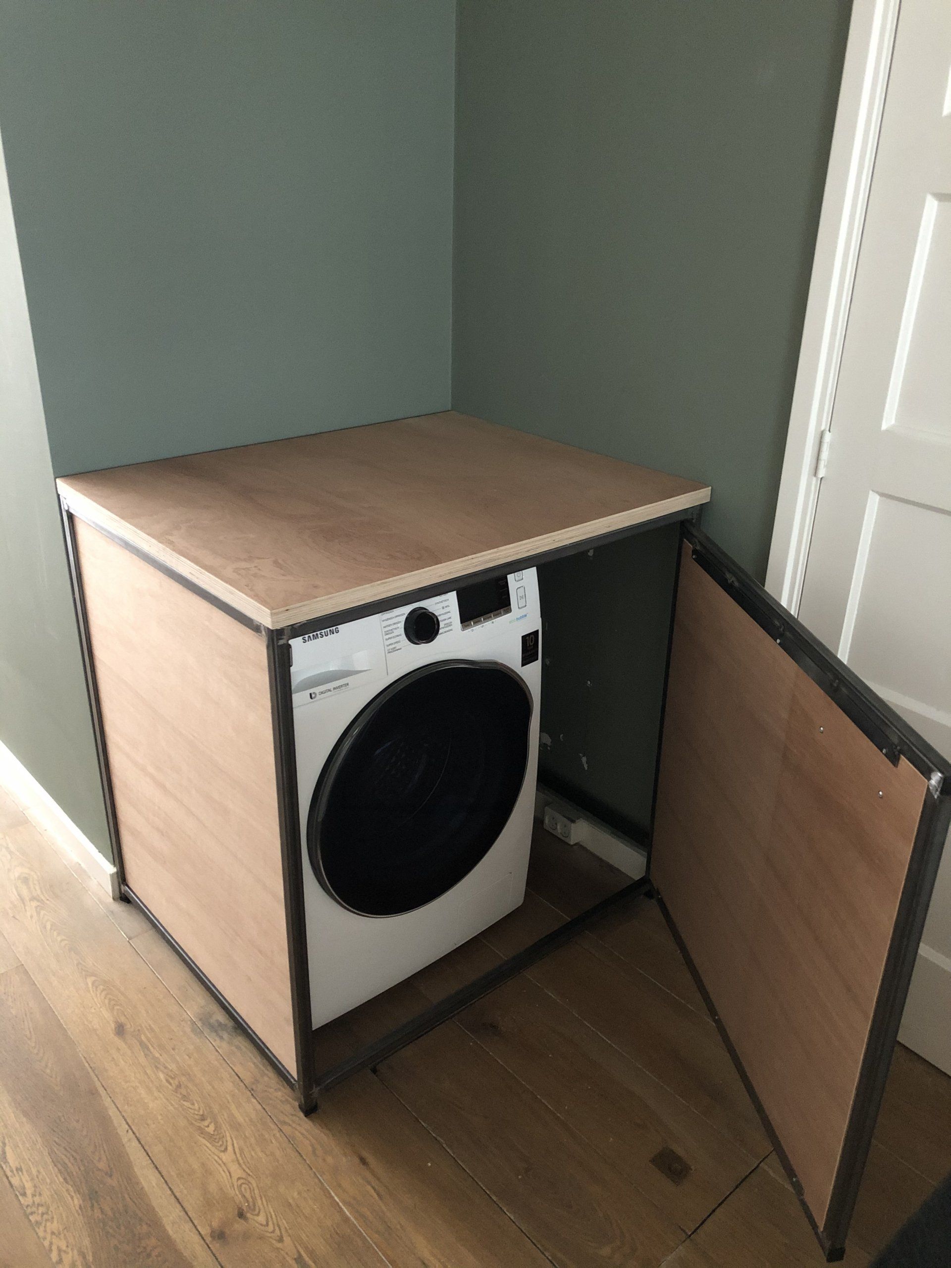 Because the washing machine was in an unconventional location in the living room, I relocated all the connections (water supply, drainage, and electrical) beneath the floor. Afterward, I crafted an elegant steel and wood cabinet to conceal the washing machine.
