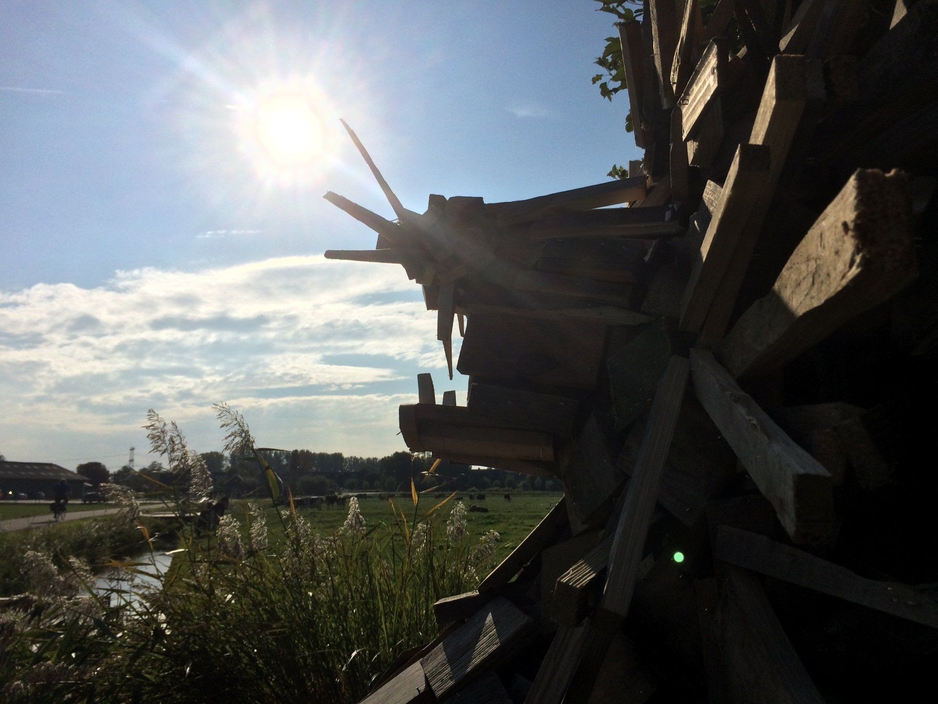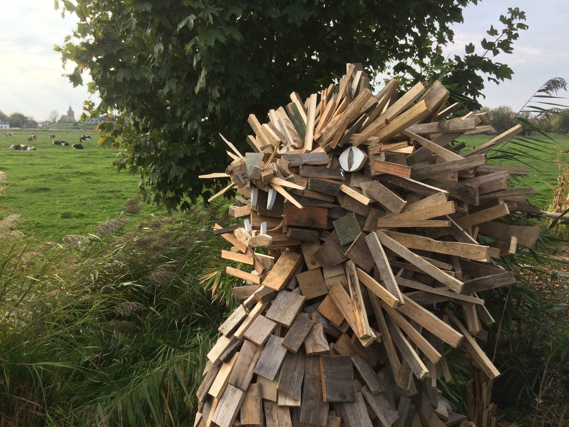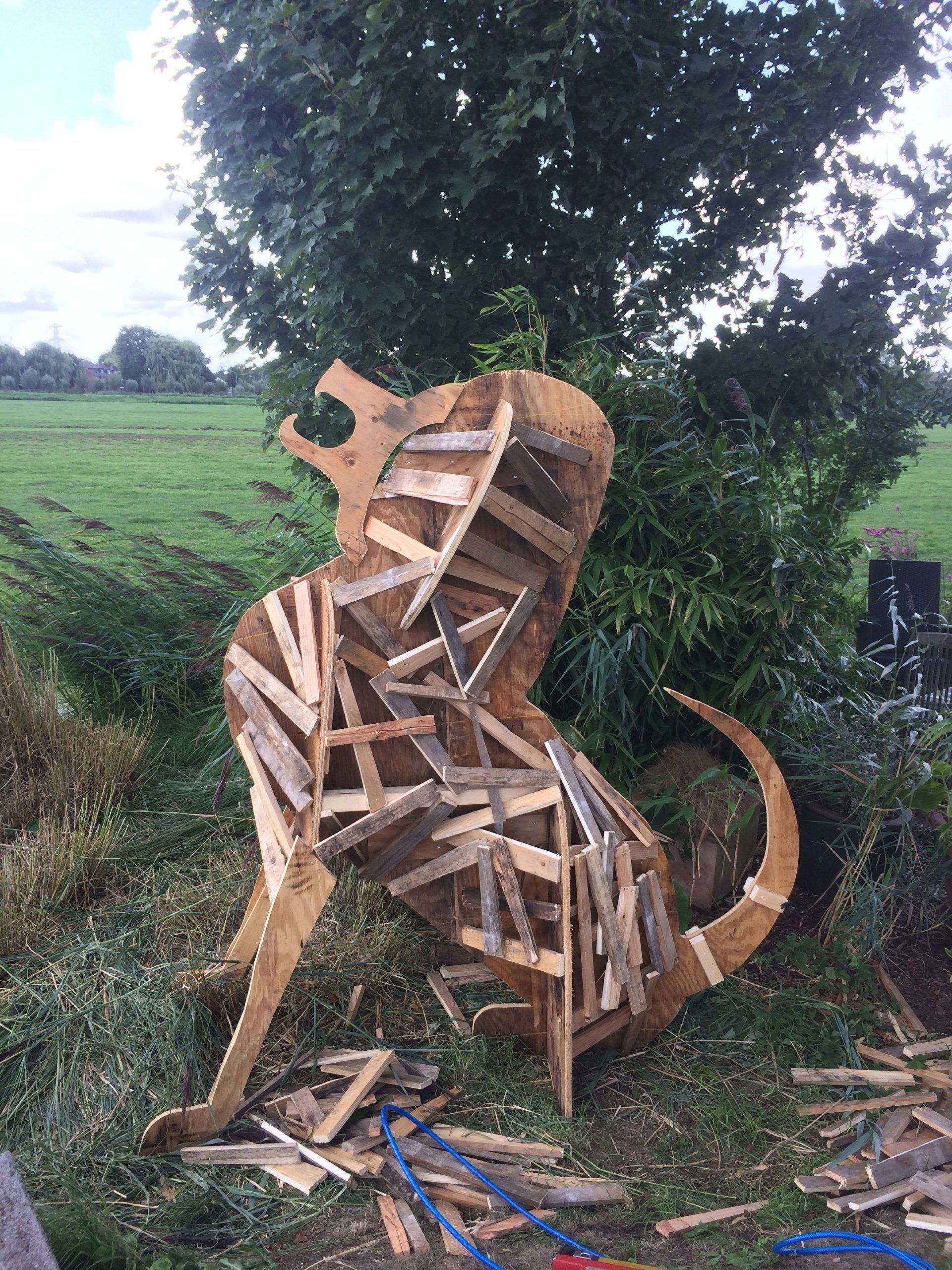 Using a couple of old underlayment boards, reclaimed pallets, a saw, and a nail gun, I collaborated with Vrijplaats X to construct two lions. The lion featured in the photo was mainly shaped with small pieces of wood, and strangely enough, it bears a striking resemblance to its creator.