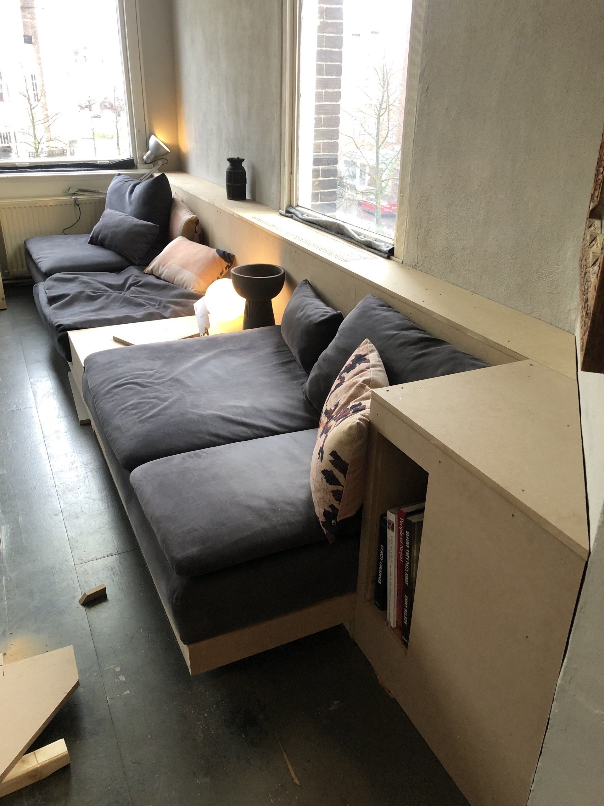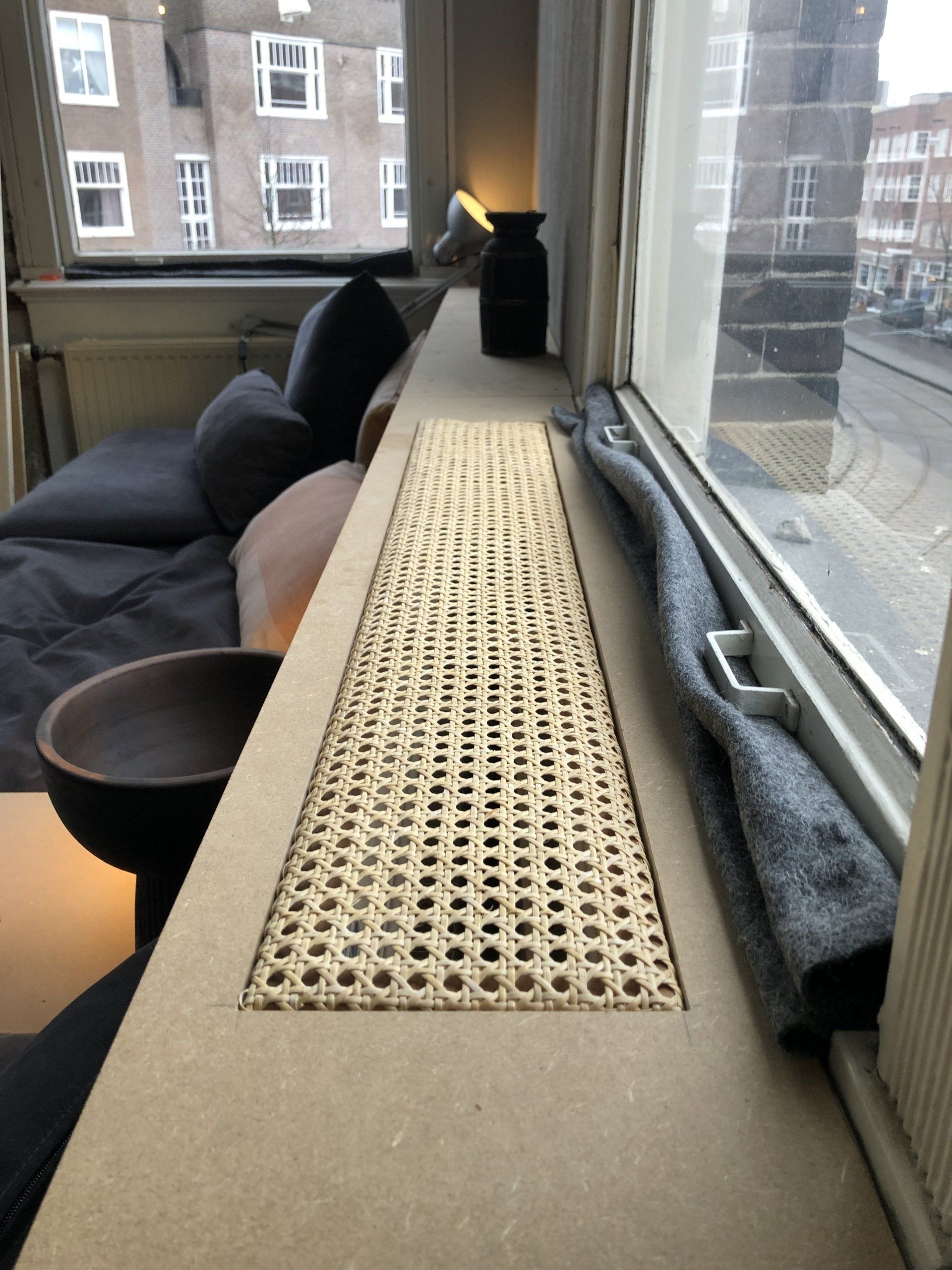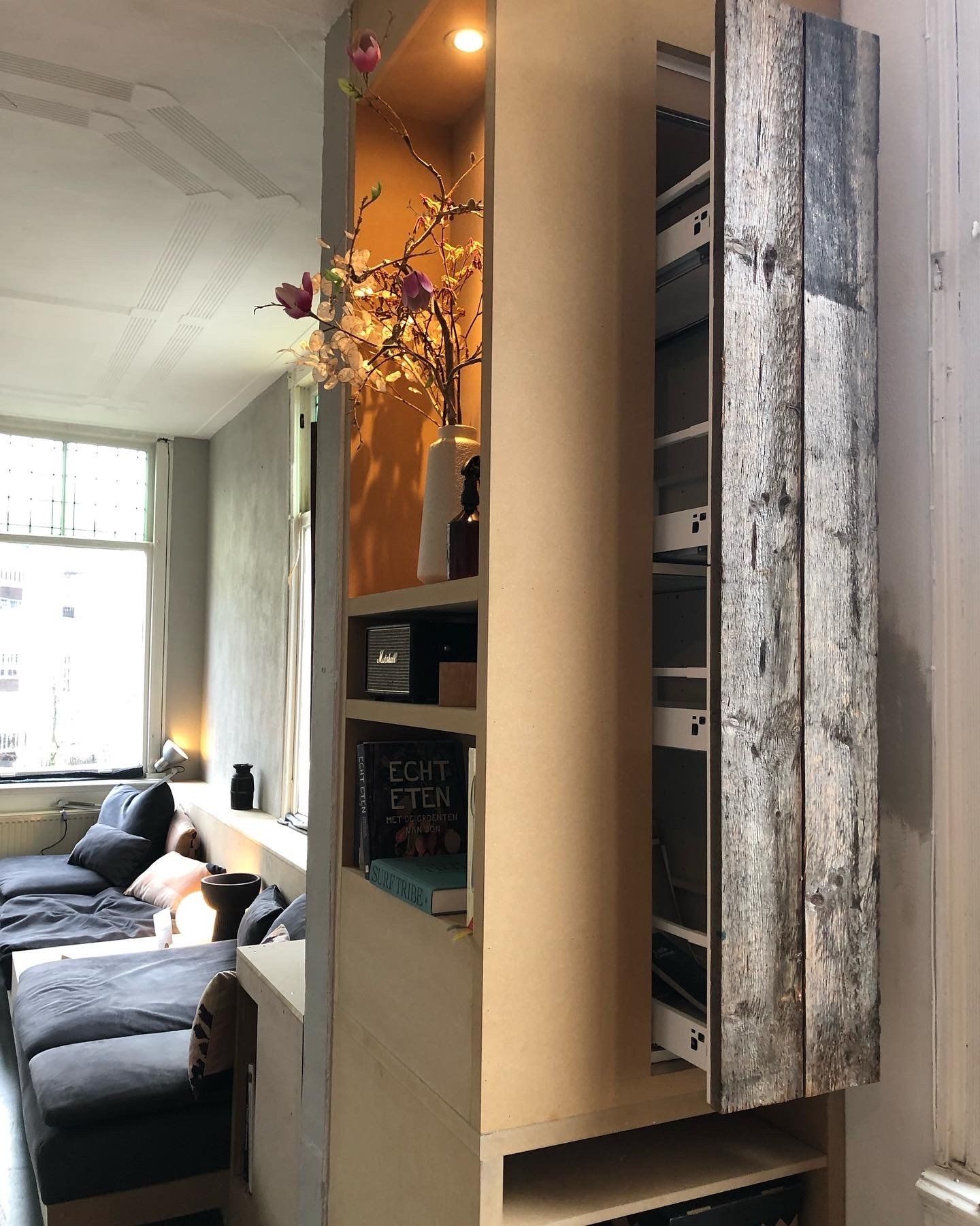 Interior designer Indigo&Wolff designed a cabinet and sofa for her home. It was my job to convert this design into material and build it. Both elements are custom made and fit exactly in all (crazy) corners of the house. The sofa seems to float, is an extension of the windowsill and hides the radiator with a heat-permeable rattan webbing grille. The cabinet is equipped with a spotlight to illuminate a beautiful object, has a drawer for storing papers and a pharmacy cabinet incorporated with a custom-made front from driftwood.
