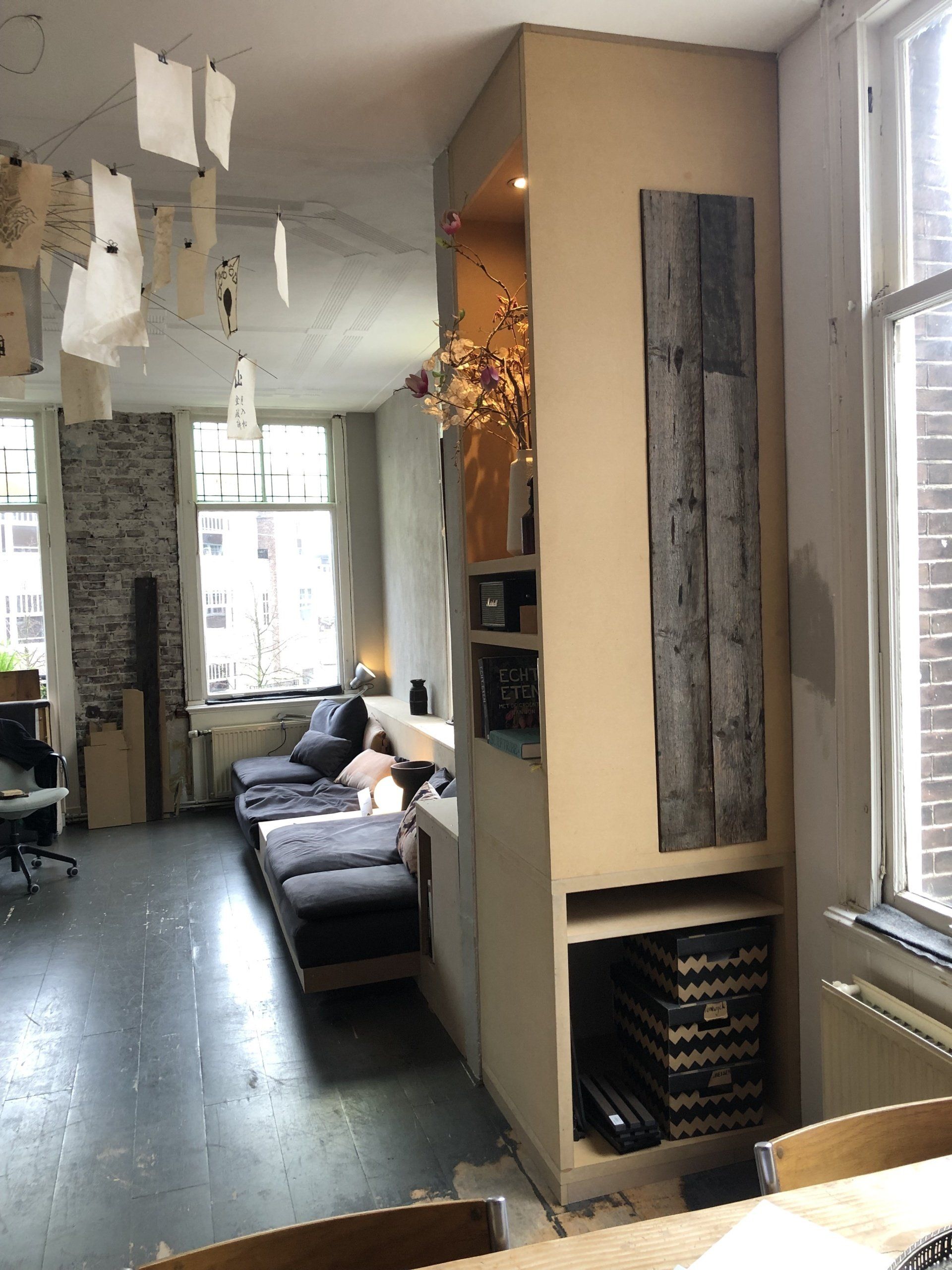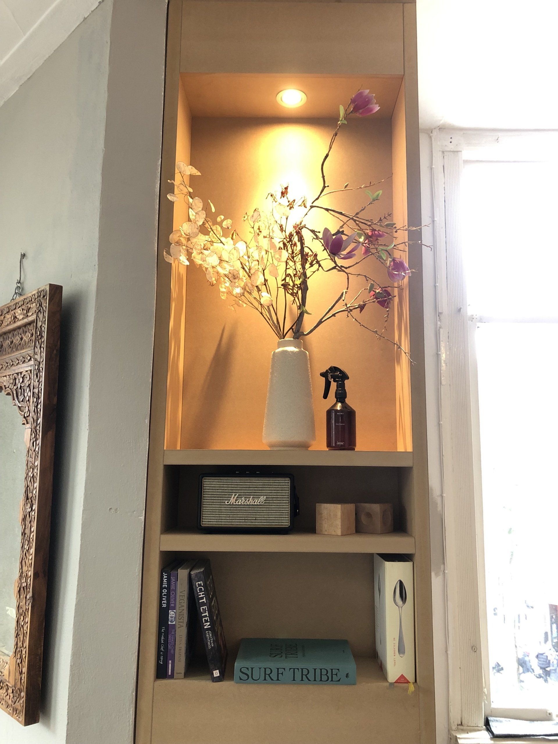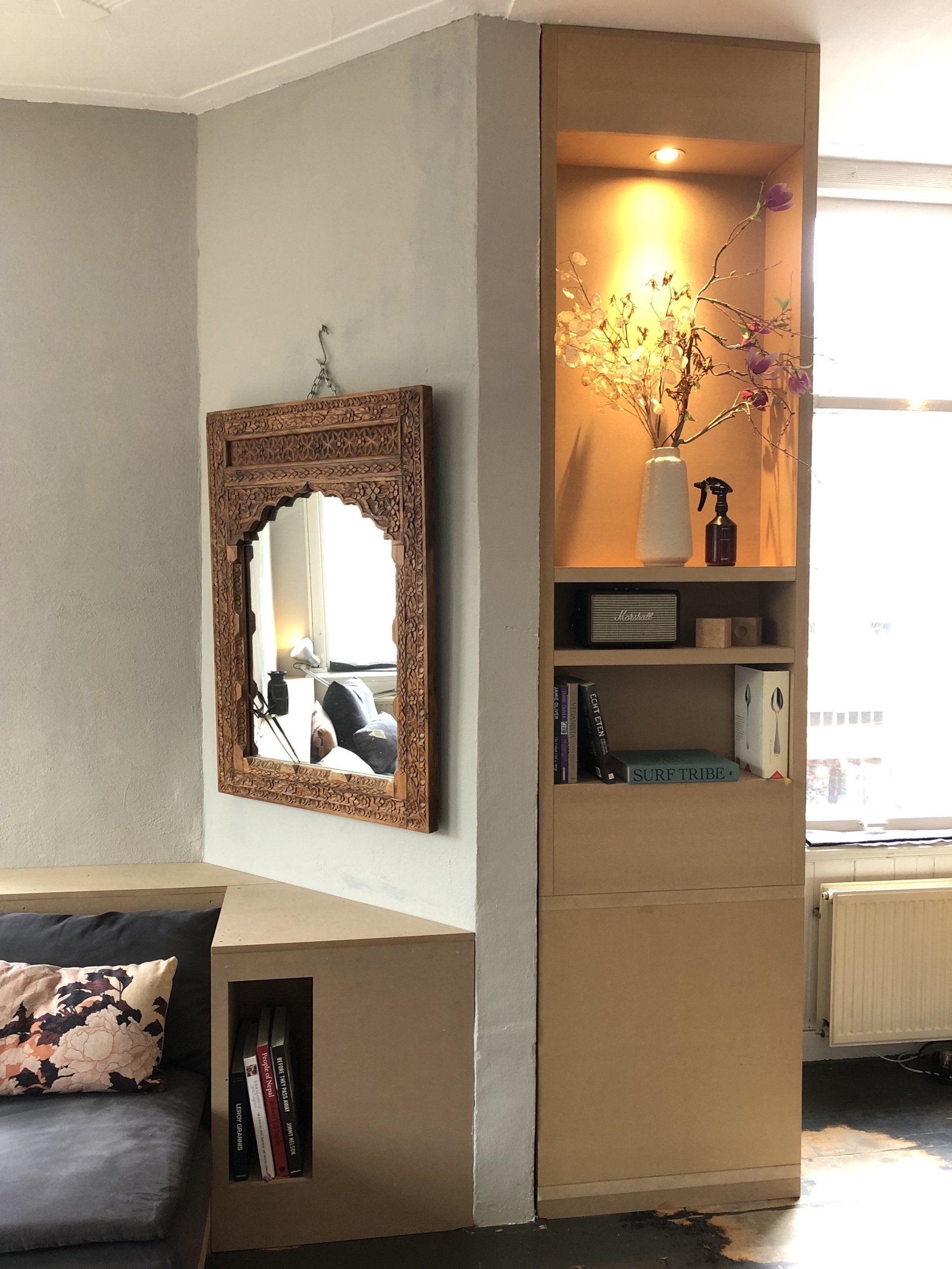 Interior designer Indigo&Wolff designed a cabinet and sofa for her home. It was my job to convert this design into material and build it. Both elements are custom made and fit exactly in all (crazy) corners of the house. The sofa seems to float, is an extension of the windowsill and hides the radiator with a heat-permeable rattan webbing grille. The cabinet is equipped with a spotlight to illuminate a beautiful object, has a drawer for storing papers and a pharmacy cabinet incorporated with a custom-made front from driftwood.