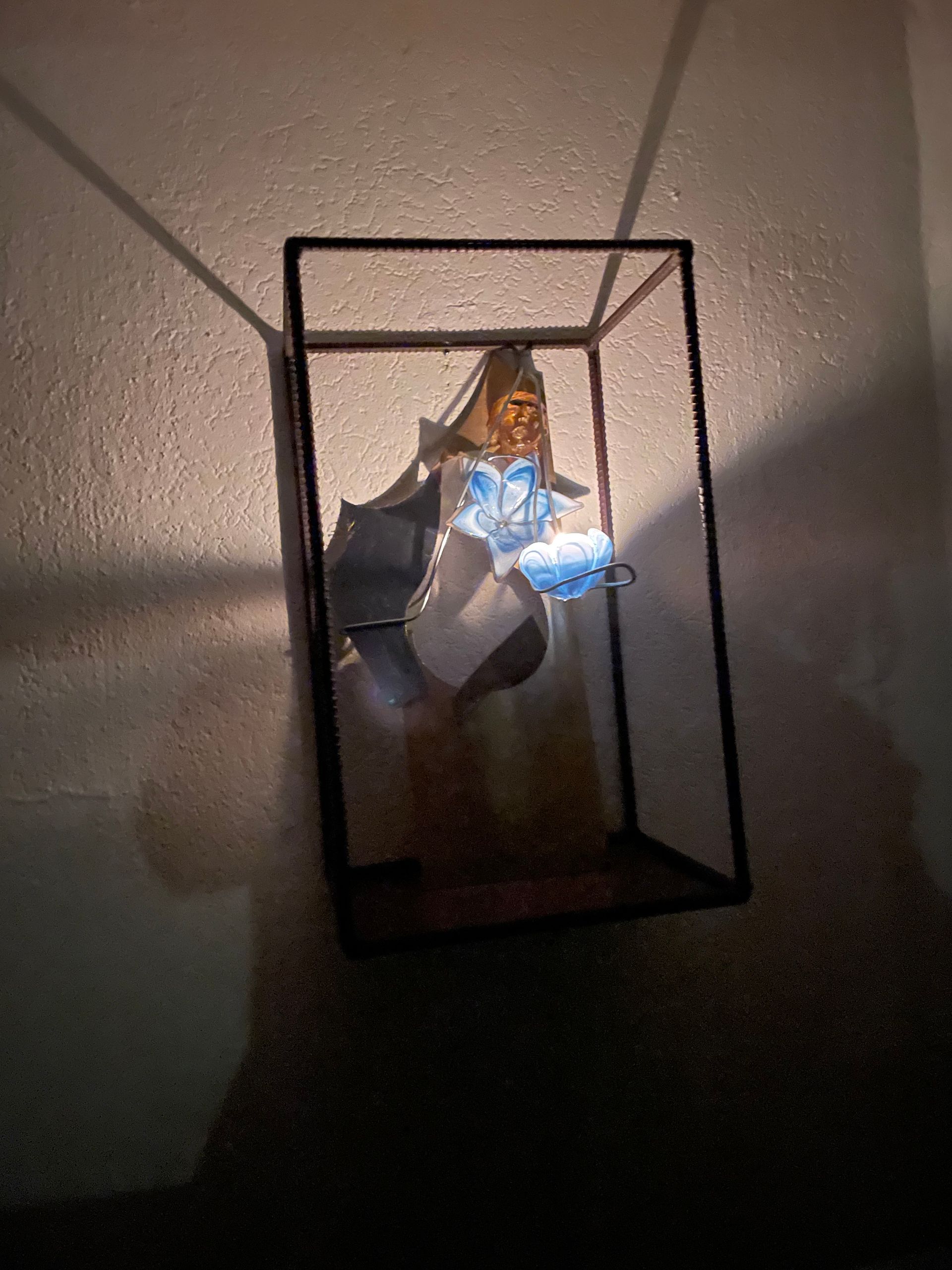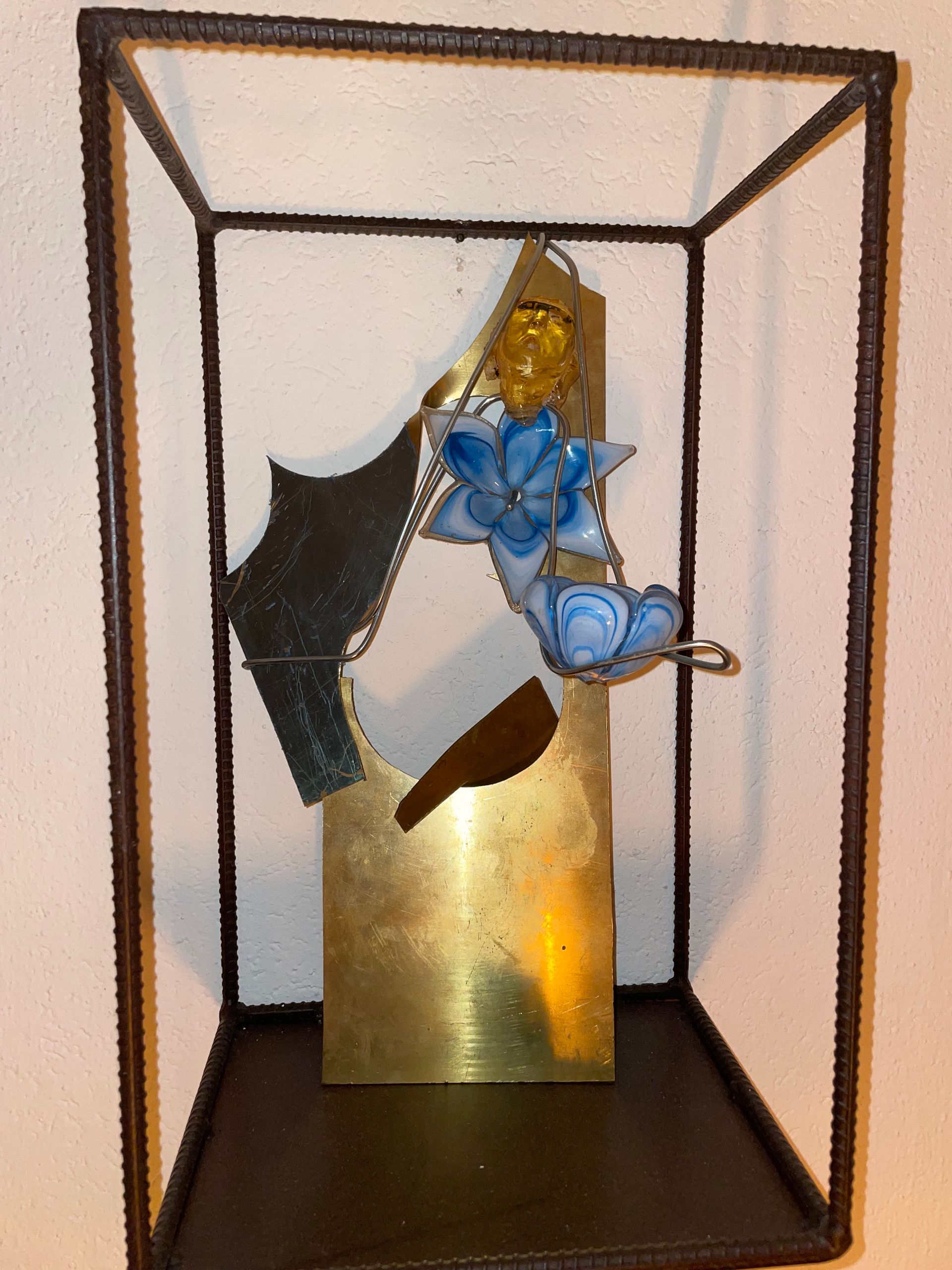 She consists ou of scrap piece of brass from another project, a steel clothing hanger that is swisted and bended around round it, 2 glass flowers and my head in epoxy at the top.