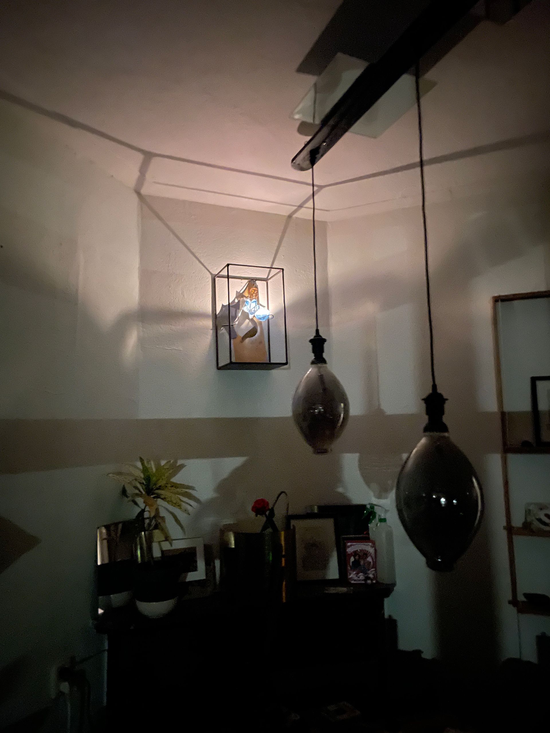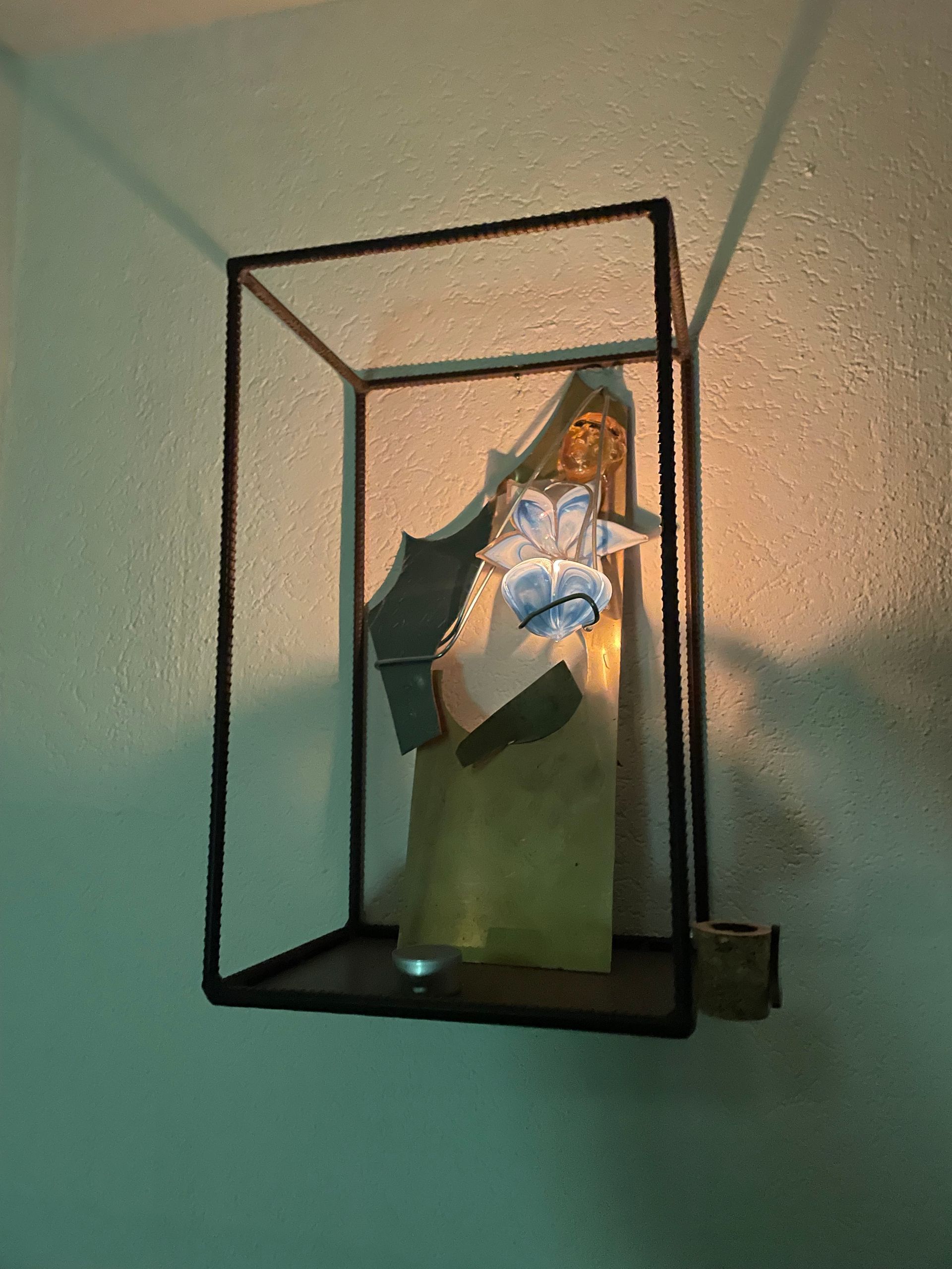 This MODERN MARia looks over my living room, giving a peaceful light during the dark days. She came to being in separate stages, during a year time, while being moved around in my livingroom.  A slow pased project that needs time to develope.
