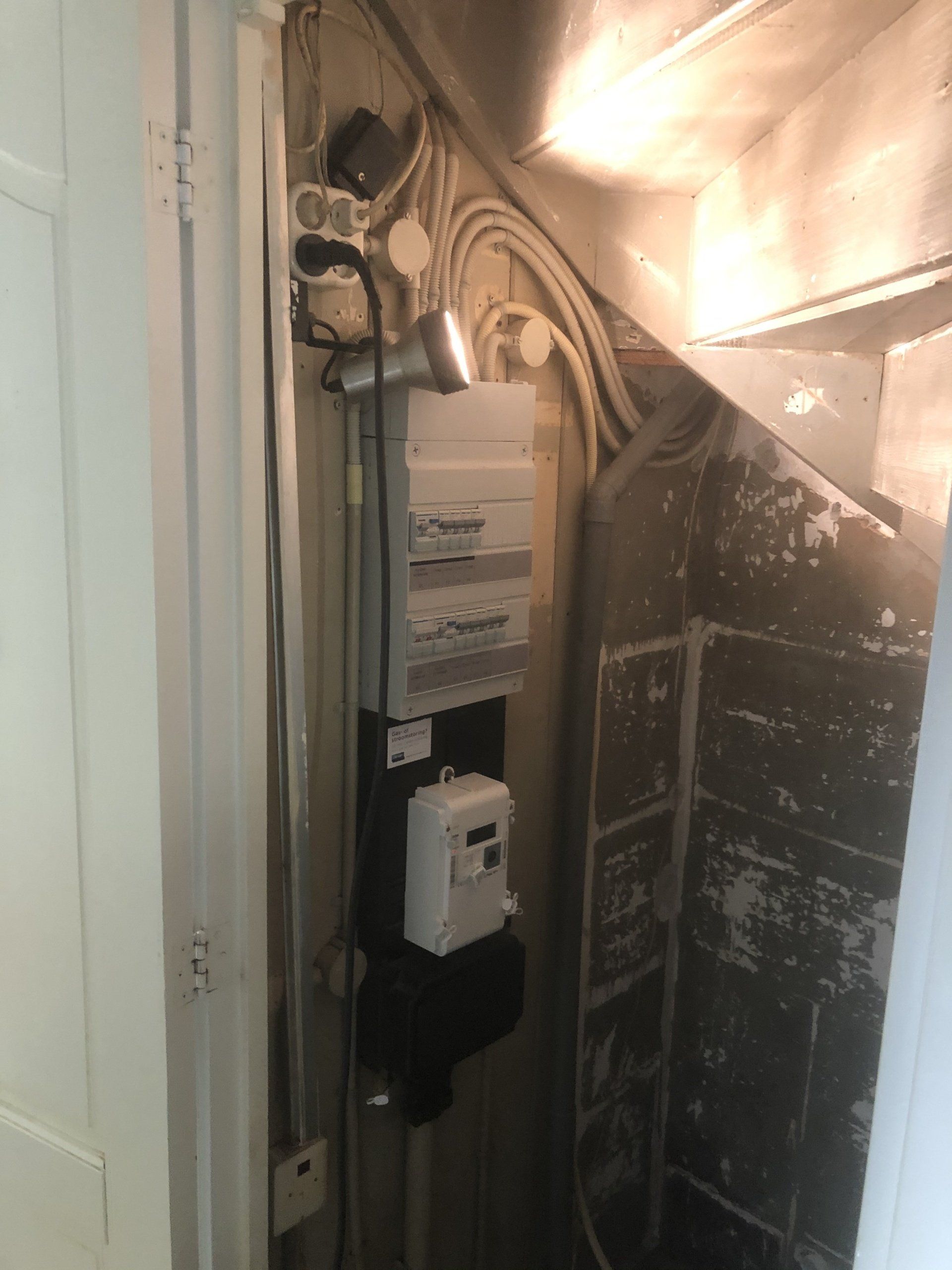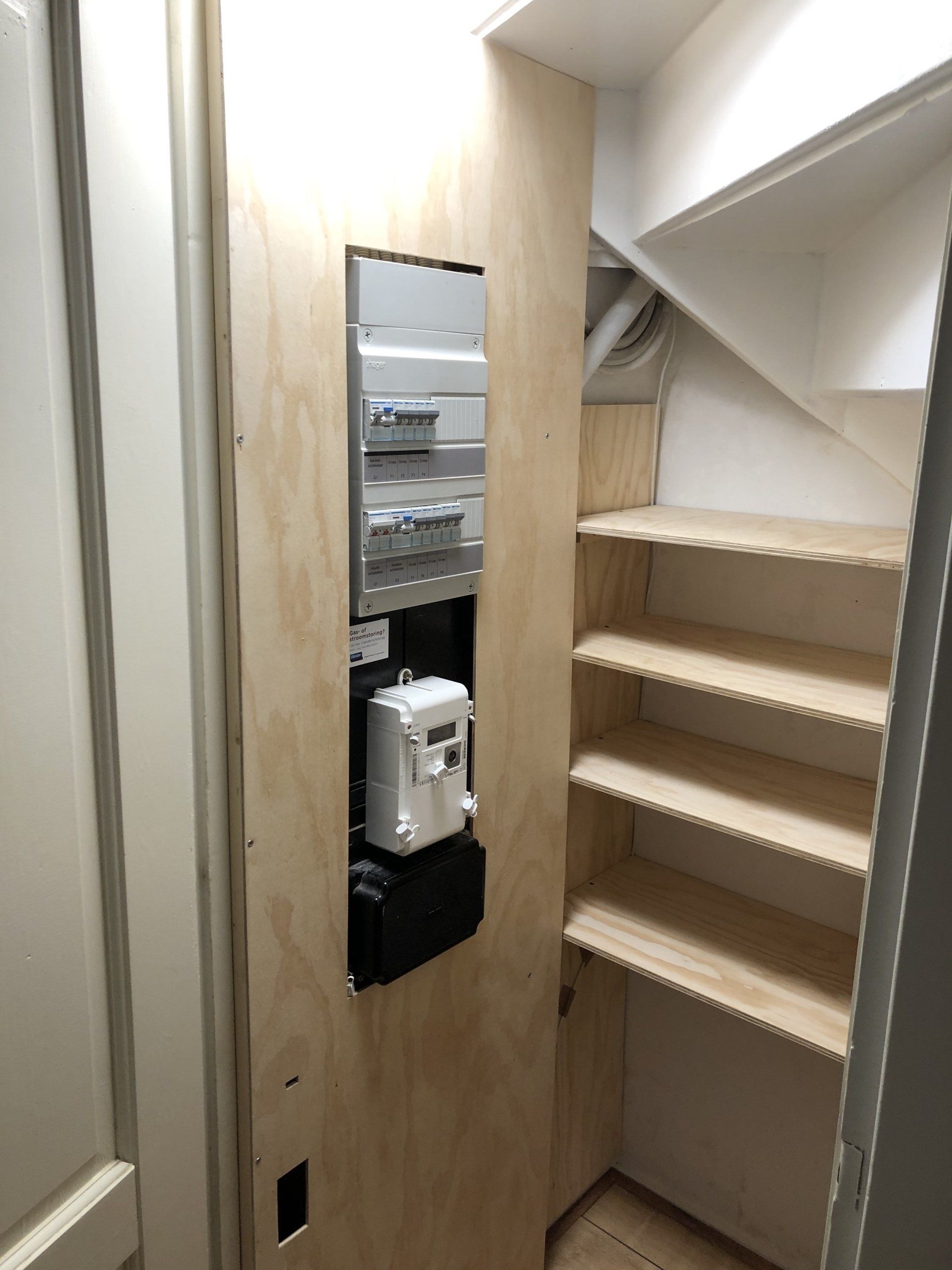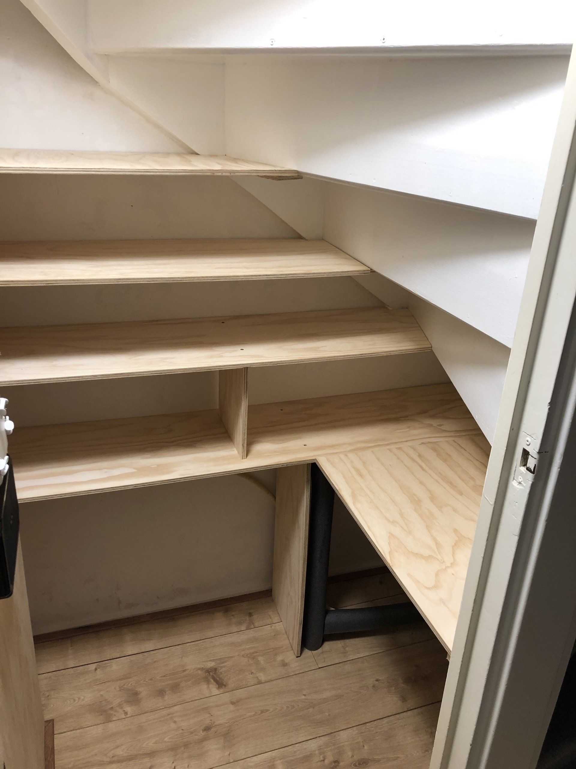 Deze lelijk geworden, oude en donkere trapkast was aan een opknapbeurt toe. Ik heb de muren en trap opnieuw geschilderd met witte verf om de ruimte wat koeler, lichter en 'groter' te maken. Met de mooie laminaat vloer, het wegwerken en beschermen van de elektra en buizen, nieuw licht en een nieuwe indeling met mooie houten planken is deze kast weer puntgaaf.